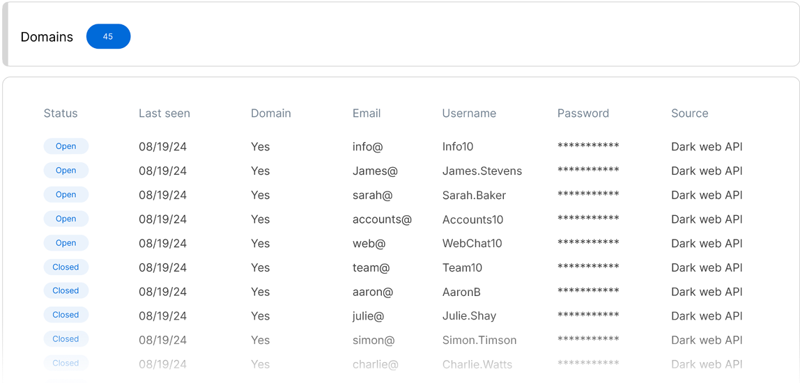 Our dark web monitoring platform excels in scanning the hidden recesses of the dark web to instantly identify compromised data such as usernames and passwords. By leveraging sophisticated algorithms and extensive databases, our platform can quickly detect and flag any instance of your sensitive information being sold or traded. This capability not only helps in mitigating the risk of data breaches but also acts as a deterrent against potential cybercriminals who might target your business.